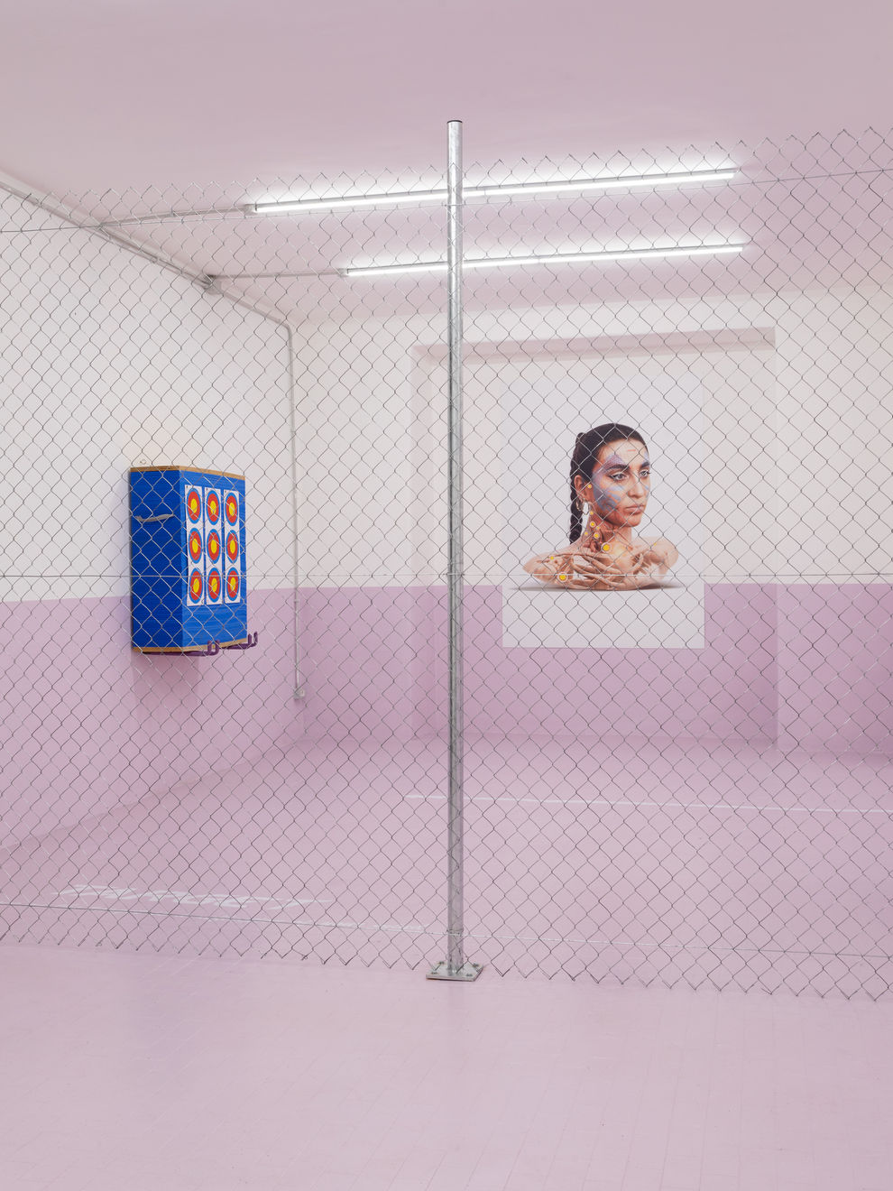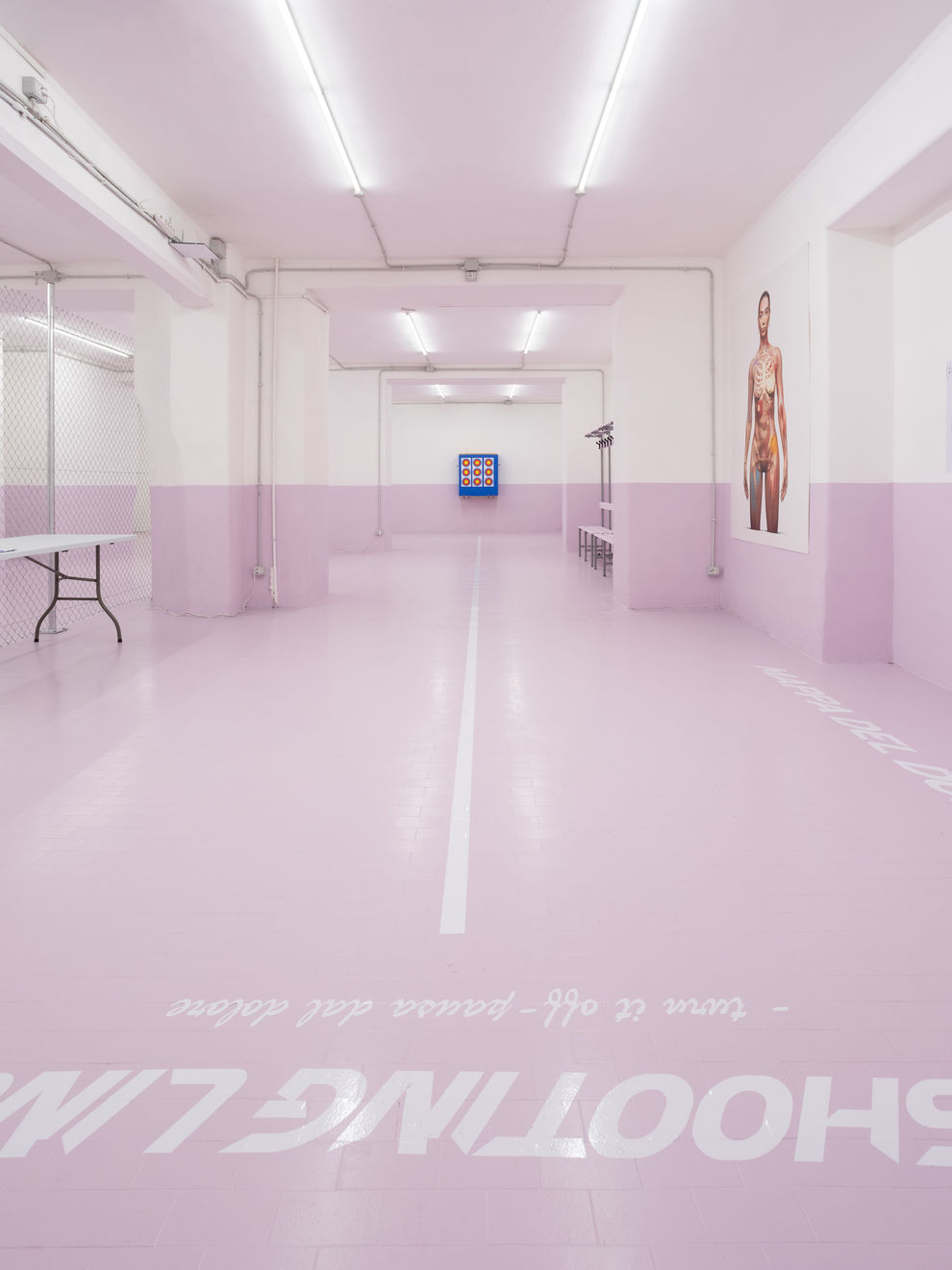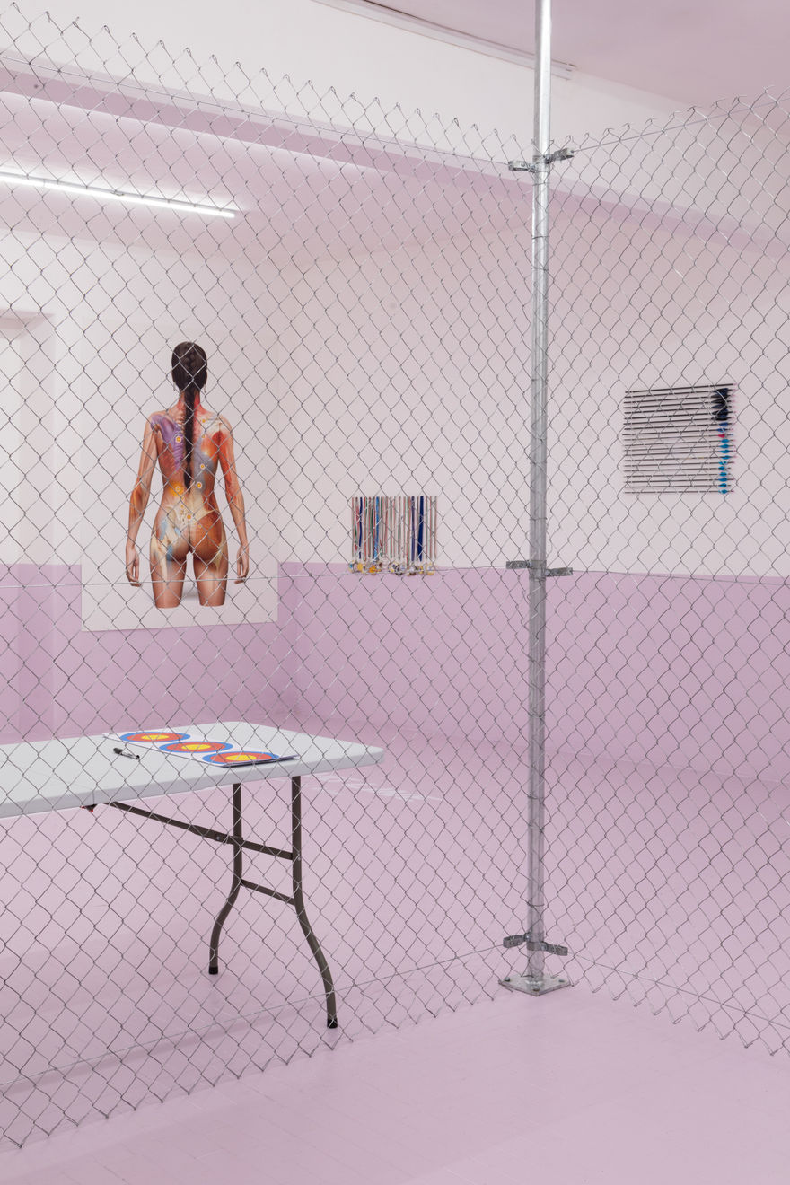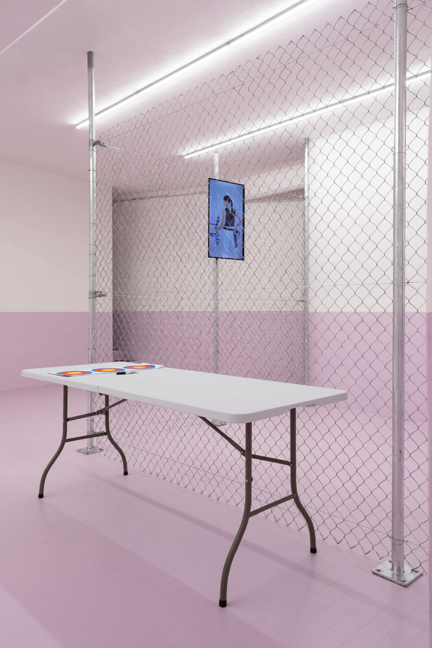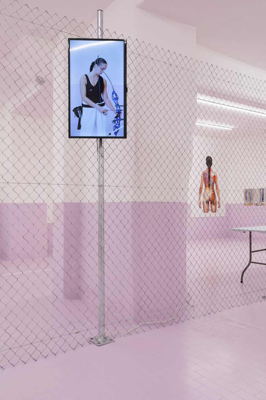 "For her solo show Sempre contratta at Basement Roma, SAGG Napoli builds the architectural dimension and physical apparatus of an exercise area into the gallery [...]. A new series of artist’s portraits in different media punctuates the space. At the back, SAGG’s body is drawn over three anatomical maps – mappe del dolore, “maps of the pain”, as the artist calls them – showing trigger points connected to specific areas of muscular tension. Hanging on the perimeter of the gym, three videos showcase her warmups and archery exercises [...]. Much of SAGG’s artistic output is deeply intertwined with all aspects of her life, channelling the pursuit of an energy shift through mind and body work. In this spirit, Sempre contratta places the accumulation and dispersal of muscular and psychological tension in dialogue with one’s broader sense of self-worth, identity and agency."